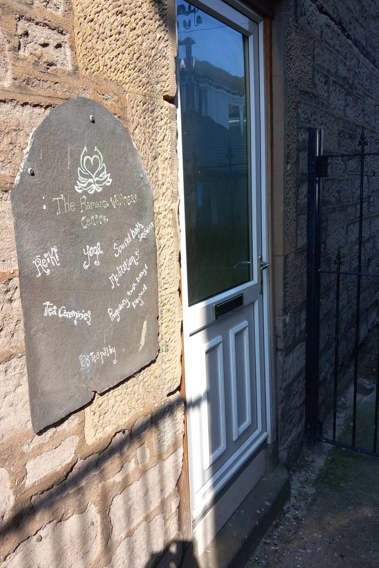 The entrance to the Ramana Wellness Centre is on the right-hand side of the building, with clear signage outside the door.
